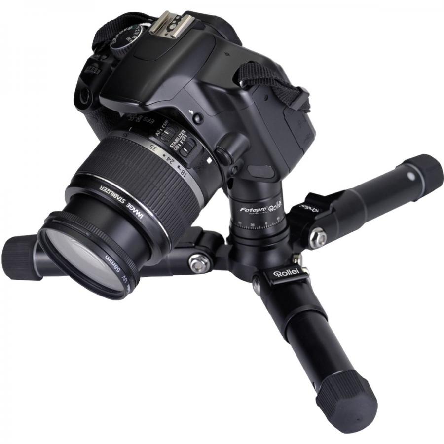 Le Trépied Rollei Compact Traveler Mini M-1 Noir combine les avantages et la capacité de support de charge d'un trépied standard. Le Compact Traveler Mini M-1 est fabriqué en aluminium léger. Il ne pèse que 800 grammes, rotule incluse. Les jambes sont composées de cinq segments. Elles peuvent être rassemblées pour former un bloc de 15 cm. Le Rollei Mini M-1 n'est pas très volumineux. Il peut se replier sur une hauteur de travail de 12 à 41 cm, idéale pour la macrophotographie, mais peut également être utilisé pour la photographie nocturne, pour des photos de groupe avec le retardateur, ou pour des panoramas sur un mur, le rebord d'une fenêtre ou le toit d'une voiture. Le Rollei Mini M-1 peut supporter un poids d'au moins 8 kg, ce qui est suffisant pour un appareil photo reflex couplé à un grand objectif.