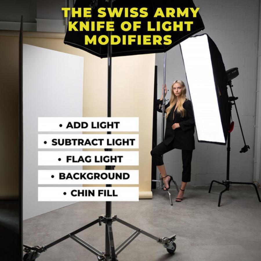 De Foldable V-Flat 2.0 is dubbelzijdig in klassiek wit en zwart en is meer dan alleen een plaat schuimkern. Het dient als een veelzijdig hulpmiddel dat licht eenvoudig reflecteert, aftrekt en blokkeert. Perfect voor het markeren van licht en het creëren van uitgeblazen witte achtergronden, het transformeert elke opstelling. Wanneer het niet als lichtmodifier fungeert, gaat het naadloos over in een set-element, dat fungeert als achtergrond of zelfs een draagbare kleedkamer voor modellen.