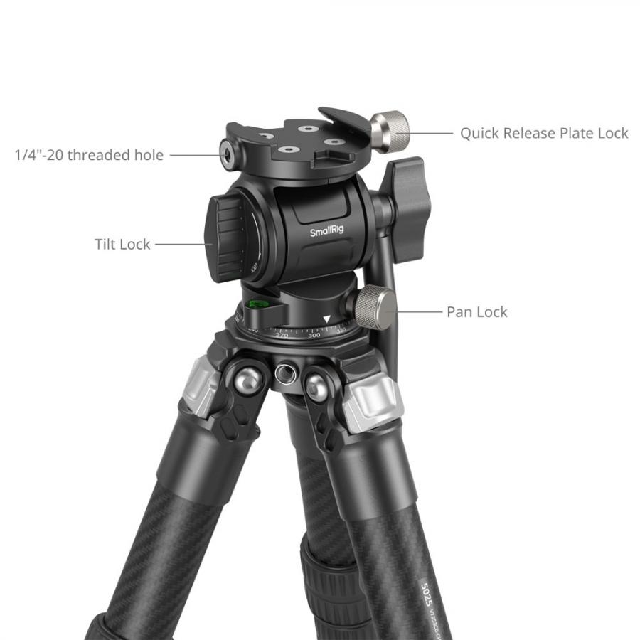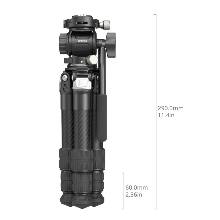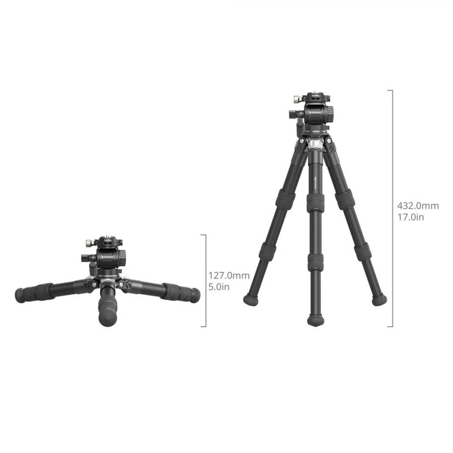 SmallRig Heavy Duty Carbon Fiber Tafelblad Statief Kit (VT253C0-CH3) 5025, Een hoogwaardig, heavy-duty desktop statief gemaakt van carbon buizen met een diameter tot 25,5 mm. 3 secties ontwerp met een opslaghoogte van 290 mm en een maximale hoogte van 432 mm. Terwijl het compacte en draagbare formaat behouden blijft, heeft het ook een laadvermogen van 10 kg. Gecombineerd met een kleine videostatiefkop, kan het een maximale lading van 3 kg en een tegengewichtlading van 1 kg ondersteunen, wat uitstekende prestaties levert in krappe ruimtes zoals desktop-opnamen, live streaming en het beklimmen van gebouwen. De bovenkant van het statief is verbonden met de kop met 3/8”-16UNC schroeven, en de kogelkop kan worden verwisseld volgens de gebruiksvereisten. De voetpen is verbonden met 3/8”-16UNC schroefgaten, en metalen voetpennen kunnen worden vervangen om aan te passen aan buitenopnamen.